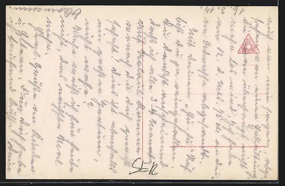 Personenbezogene Daten auf der Rückseite der Karte wurden durch blauen Textmarker unkenntlich gemacht. Die blauen Stellen sind auf die Vorderseite durchgeweicht und wirken sich negativ auf das Postkartenfoto aus