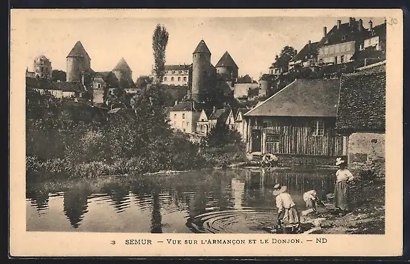 AK Semur, Vue sur l`Armancon et le Donjon, Waschfrauen am Ufer