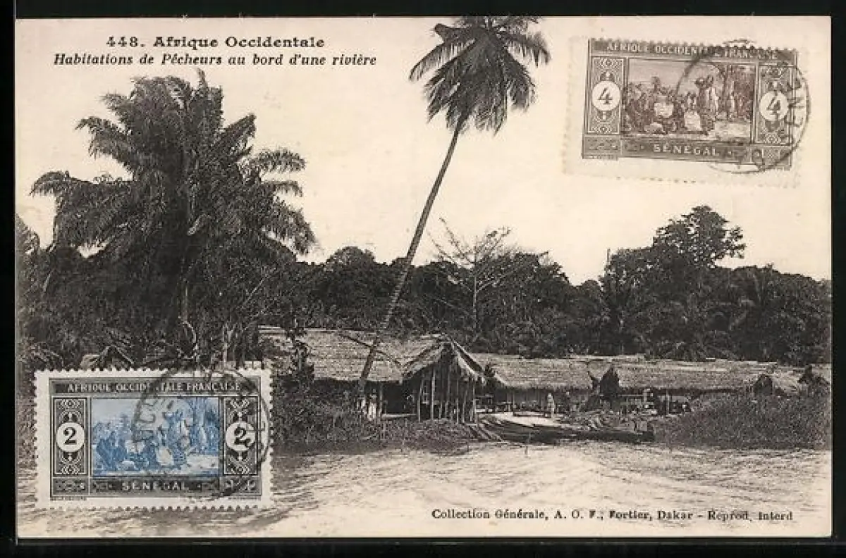 AK Senegal, Afrique Occidentale, Habitations de Pêcheurs au bord d`une rivière