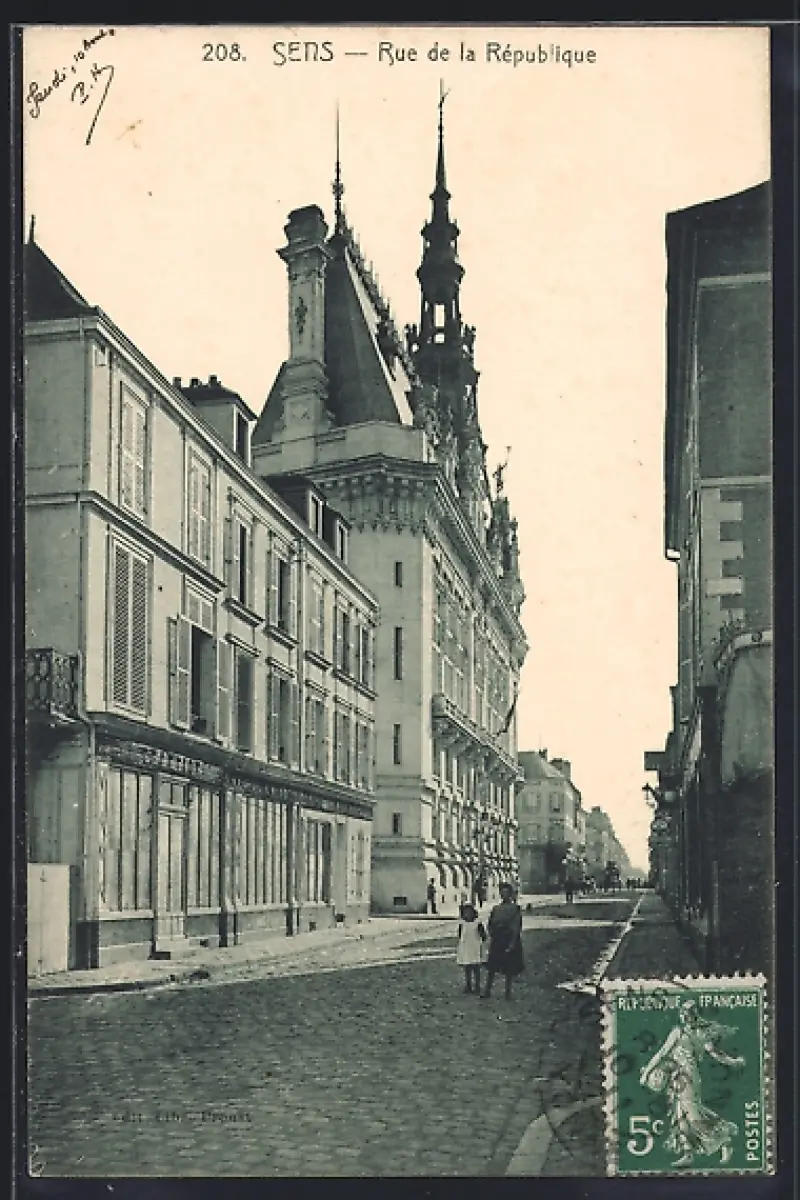 AK Sens, Rue de la République avec bâtiments historiques et passants
