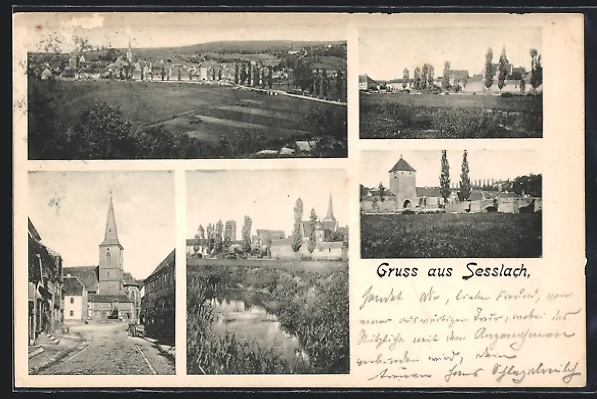 AK Sesslach, Strassenpartie mit Blick auf die Kirche, Flusspartie