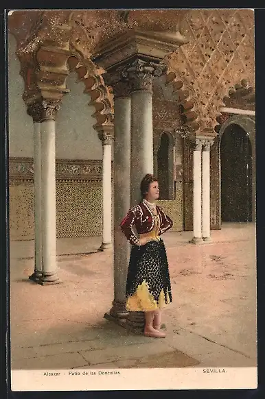 AK Sevilla, Frau in spanischer Tracht in einem Palast lehnt sich an die Säule