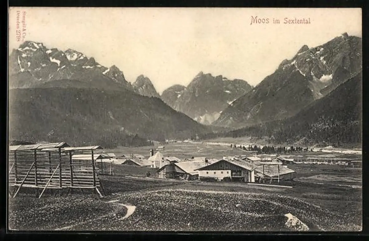AK Sexten, Moos im Sextental, Panorama mit Gebirgswand