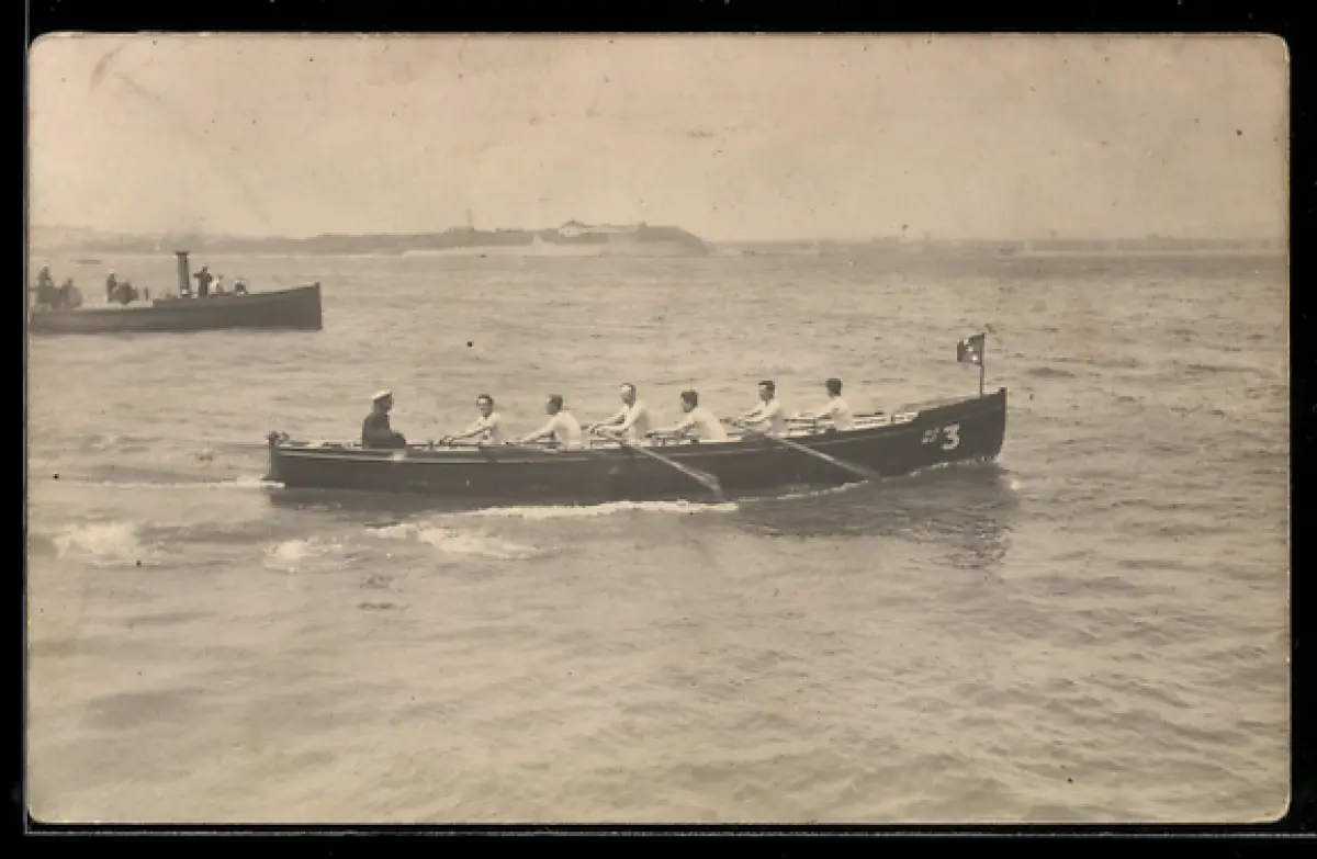AK Sieben Sportler in einem Ruderboot