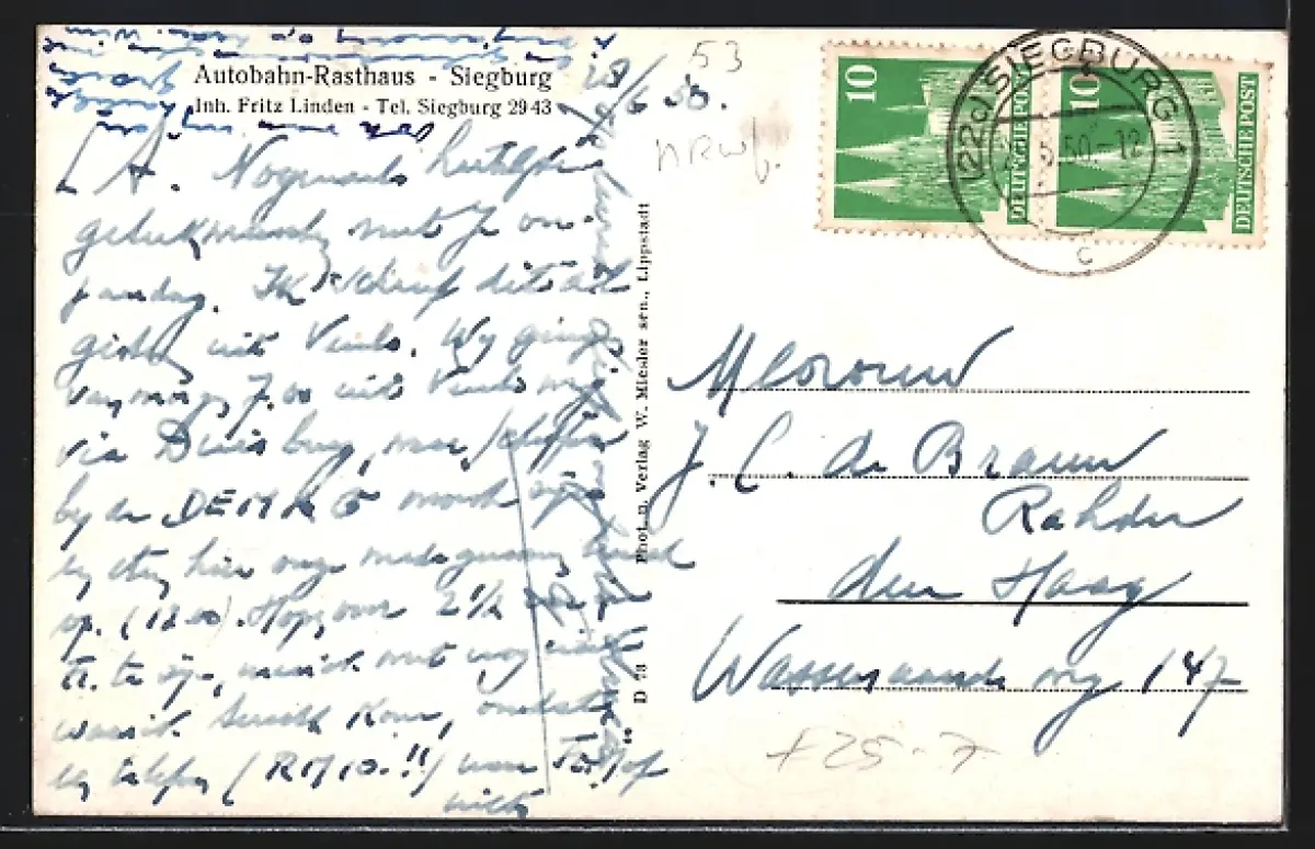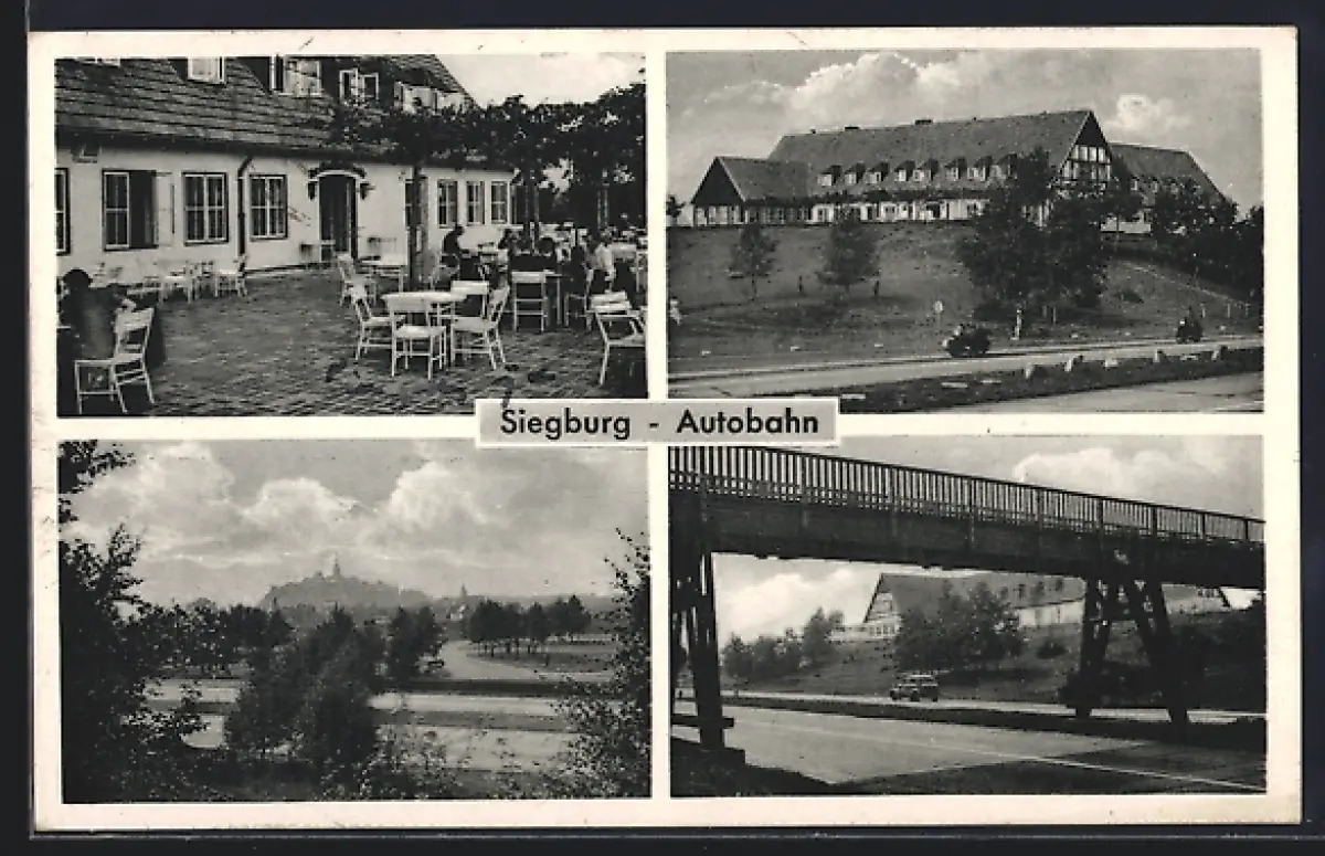 AK Siegburg, Autobahn-Rasthaus F. Linden mit Terrasse, Autobahnbrücke