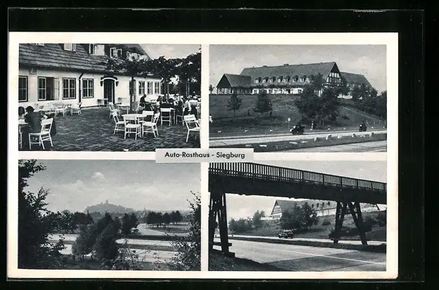 AK Siegburg, Autobahn-Rasthaus Fritz Linden mit Terrasse und Autobahnbrücke