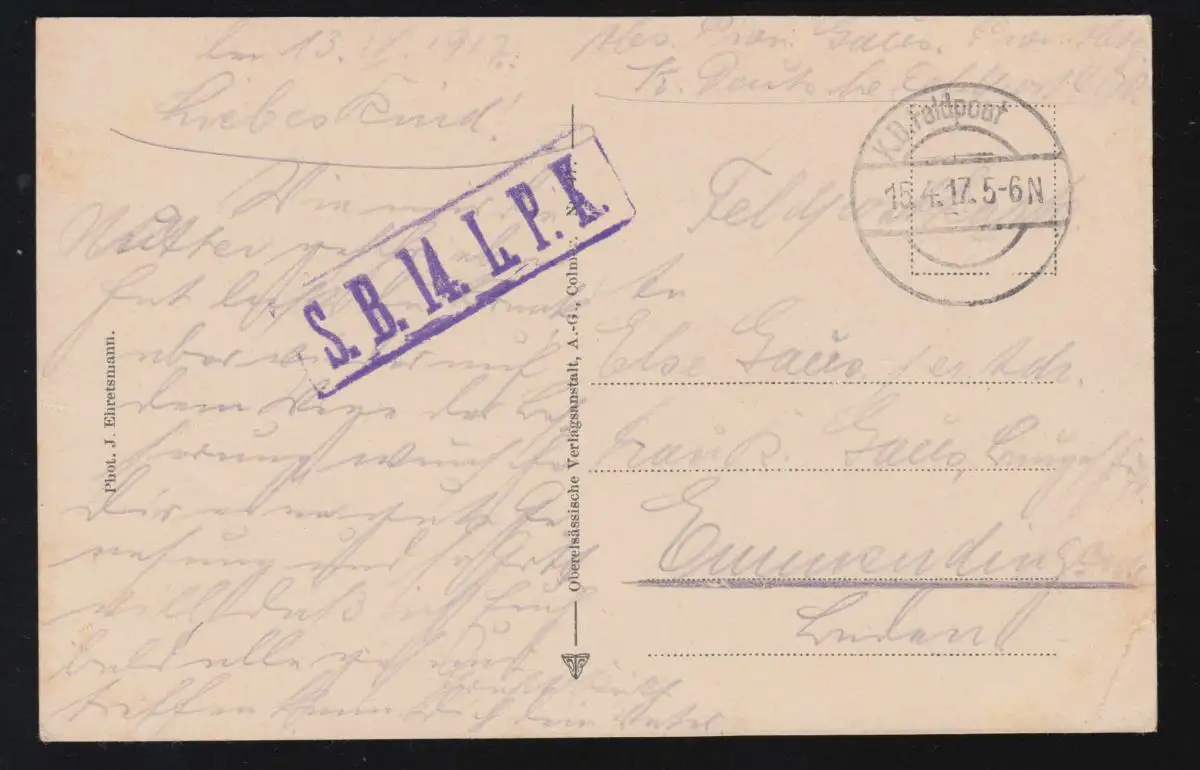 Feldpostkarte 15.4.1917 mit Briefstempel S.B. 14. L.P.K.
