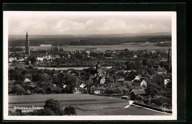 AK Simbach am Inn, Gesamtansicht mit Braunau in Österreich