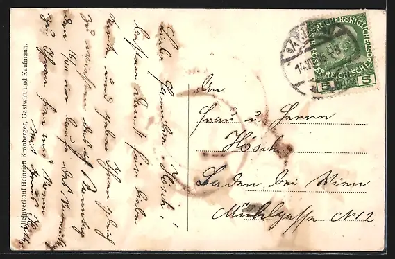 Personenbezogene Daten auf der Rückseite der Karte wurden durch blauen Textmarker unkenntlich gemacht. Die blauen Stellen sind auf die Vorderseite durchgeweicht und wirken sich negativ auf das Postkartenfoto aus