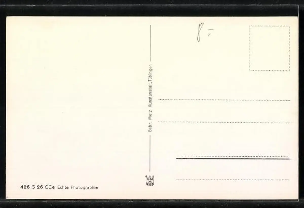 Personenbezogene Daten auf der Rückseite der Karte wurden durch blauen Textmarker unkenntlich gemacht. Die blauen Stellen sind auf die Vorderseite durchgeweicht und wirken sich negativ auf das Postkartenfoto aus