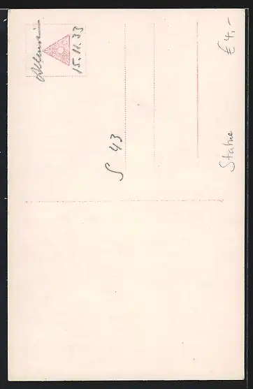 Personenbezogene Daten auf der Rückseite der Karte wurden durch blauen Textmarker unkenntlich gemacht. Die blauen Stellen sind auf die Vorderseite durchgeweicht und wirken sich negativ auf das Postkartenfoto aus