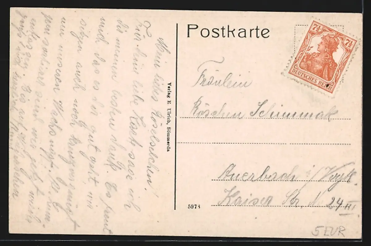 Personenbezogene Daten auf der Rückseite der Karte wurden durch blauen Textmarker unkenntlich gemacht. Die blauen Stellen sind auf die Vorderseite durchgeweicht und wirken sich negativ auf das Postkartenfoto aus