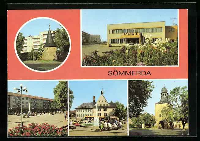 AK Sömmerda, Postgebäude, Kirche, Strassenbahn am Marktplatz