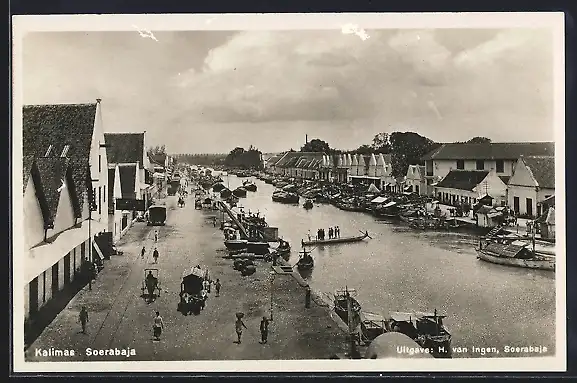 AK Soerabaja, Kalimas, Blick auf Häuser an Fluss mit Booten
