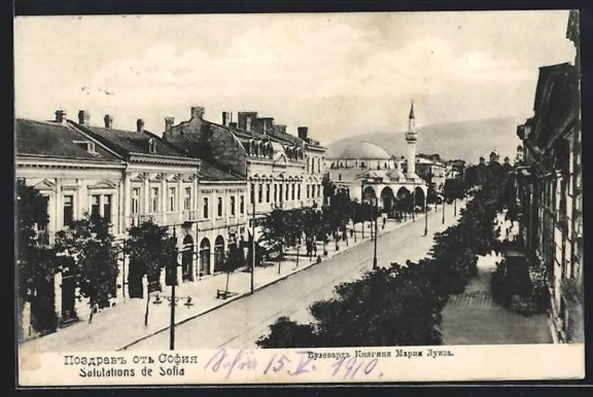 AK Sofia, Strassenpartie mit Moschee aus der Vogelschau