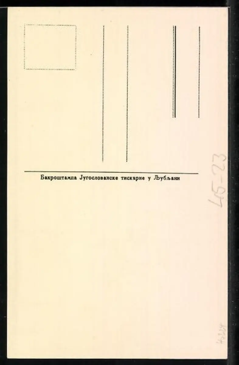 Personenbezogene Daten auf der Rückseite der Karte wurden durch blauen Textmarker unkenntlich gemacht. Die blauen Stellen sind auf die Vorderseite durchgeweicht und wirken sich negativ auf das Postkartenfoto aus