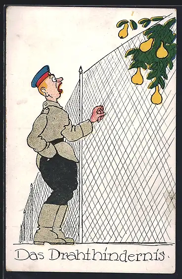 AK Soldat am Drahthindernis, kein Zugang zum Birnbaum, Soldatenhumor