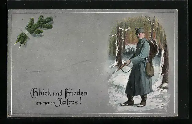 AK Soldat in Uniform mit Gewehr im verschneiten Wald, Neujahrskarte