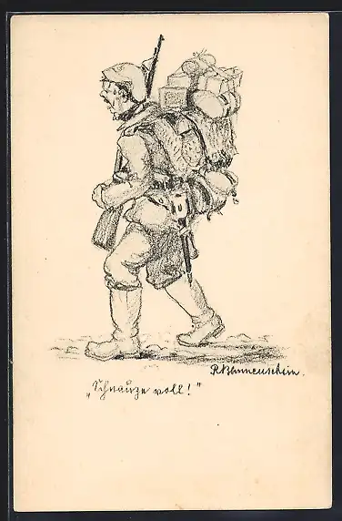 AK Soldat mit schweren Gepäck marschiert an die Front