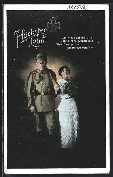 AK Soldat mit seiner Frau, Eichenzweig und Eisernem Kreuz
