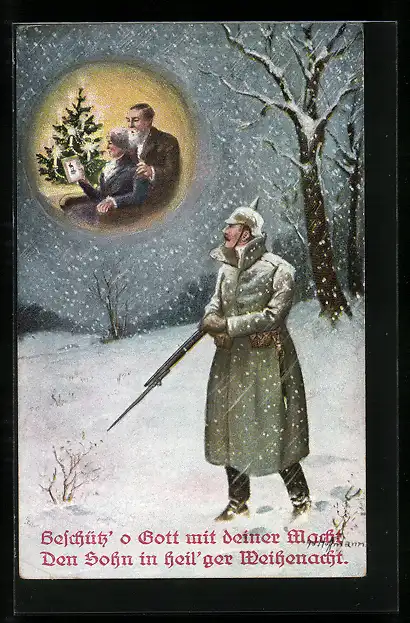 AK Soldaten in Uniform im eisigen Wald denkt an seine Eltern