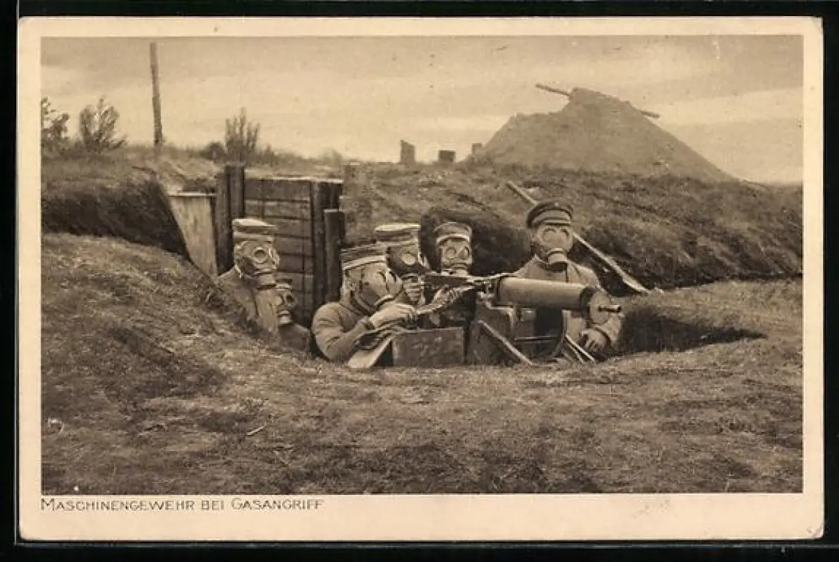 AK Soldaten mit Gasmasken in einer Schützengraben-MG-Stellung
