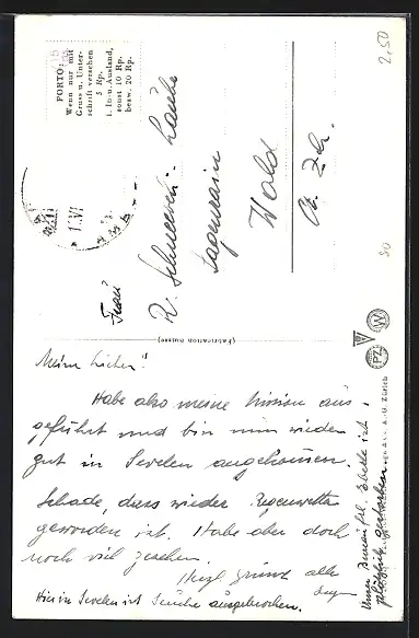 Personenbezogene Daten auf der Rückseite der Karte wurden durch blauen Textmarker unkenntlich gemacht. Die blauen Stellen sind auf die Vorderseite durchgeweicht und wirken sich negativ auf das Postkartenfoto aus