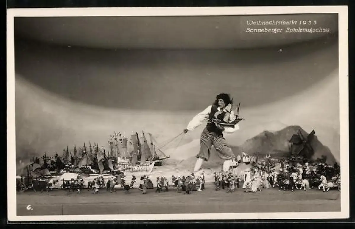 AK Sonneberg / Thür., Spielzeugmuseum mit Spielzeugschau 1933, lebensechte Puppe als Riese