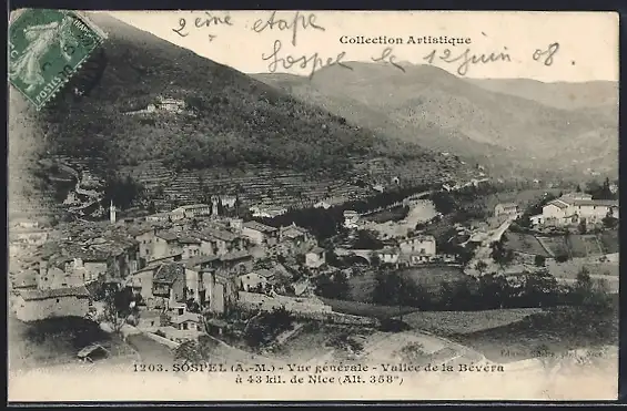 AK Sospel, Vue générale, Vallée de la Bévéra à 43 km de Nice (Alt. 388 m)
