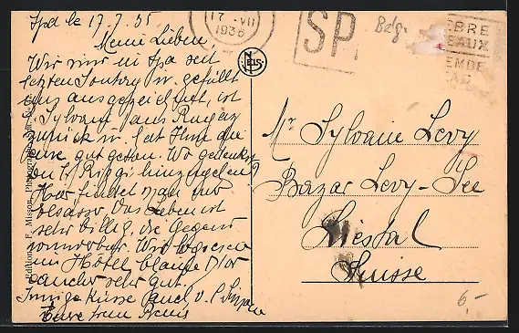 gelaufen 1936, Briefmarke entfernt, guter Zustand