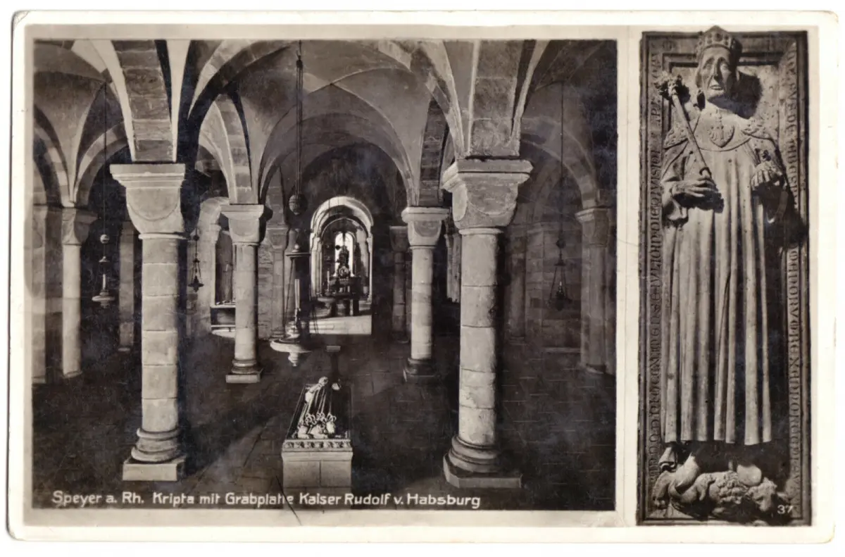 Ansichtskarte Speyer Krypta mit Grabplatte Kaiser Rrudolf v. Habsburg Erhaltung I-II ungelaufen, um 1935 Verlag: Emil Hartmann, Mannheim - 37 Der