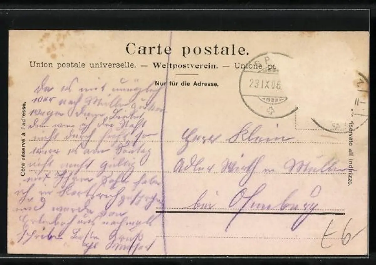 alte Ansichtskarte, gelaufen 1906, Briefmarke entfernt, rückseitig Oberflächenschaden, guter Zustand
