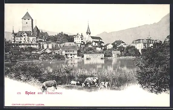 AK Spiez am Thunersee, Ortsansicht, weidende Kühe