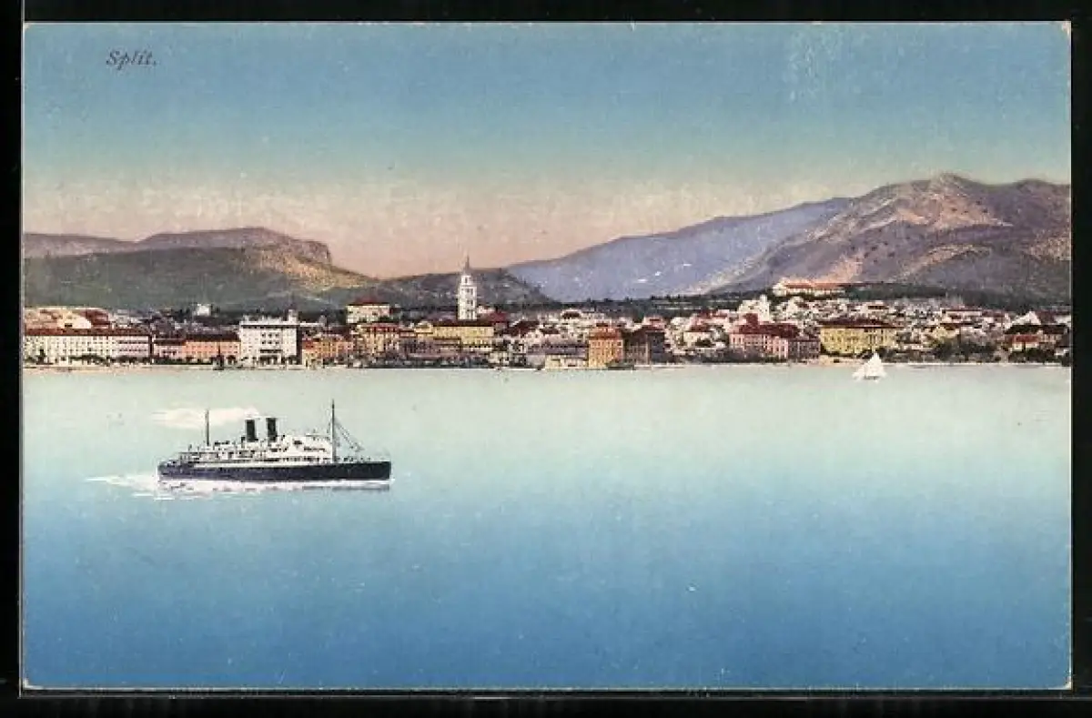 AK Split, Ortspanorama mit Dampfer