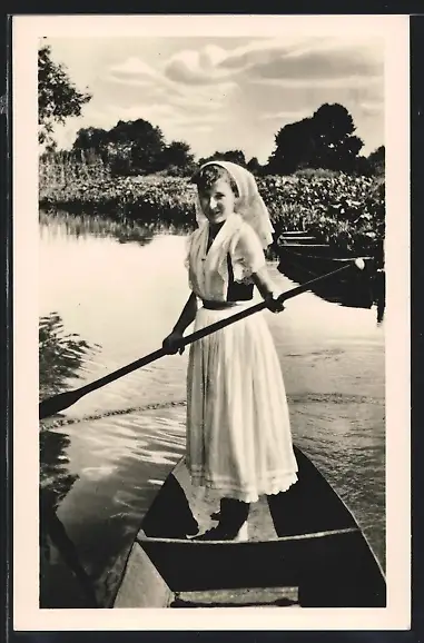 AK Spreewälderin in Festtracht in einem Kanu stehend