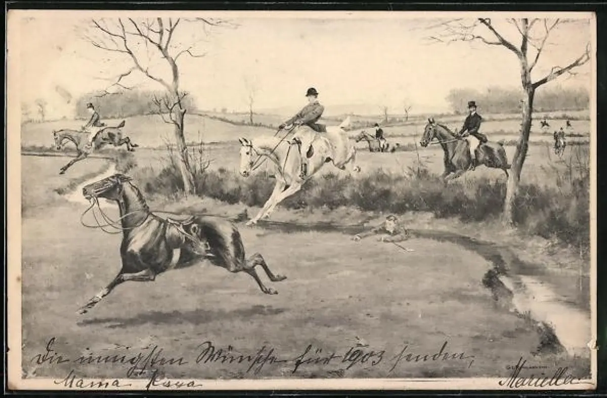 AK Springreiter am Wassergraben, Abgeworfener Reiter u. davonlaufendes Pferd