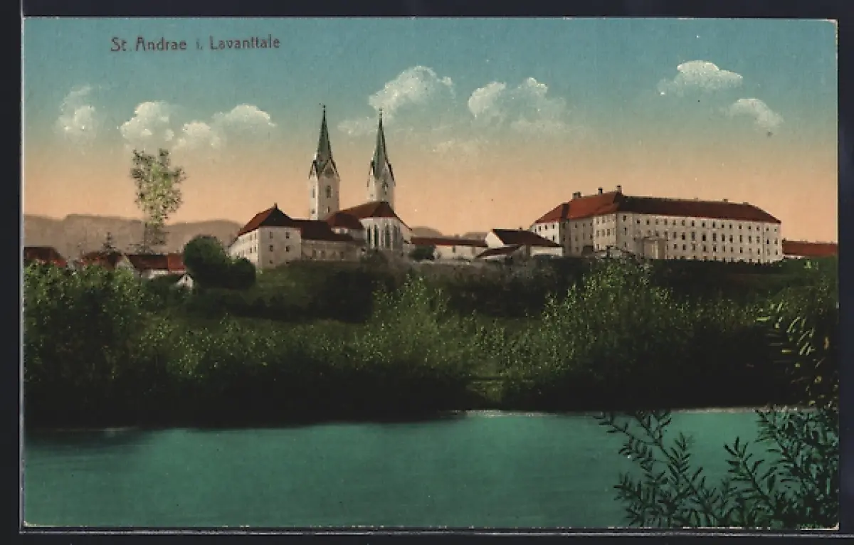 AK St. Andrae i. Lavanttale, Uferpartie mit Kirche