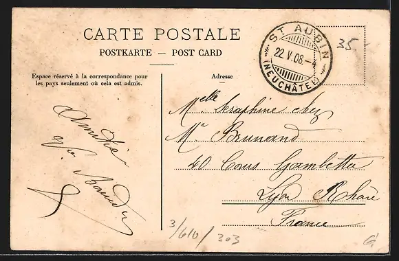 gelaufen 1908, Briefmarke entfernt, guter Zustand