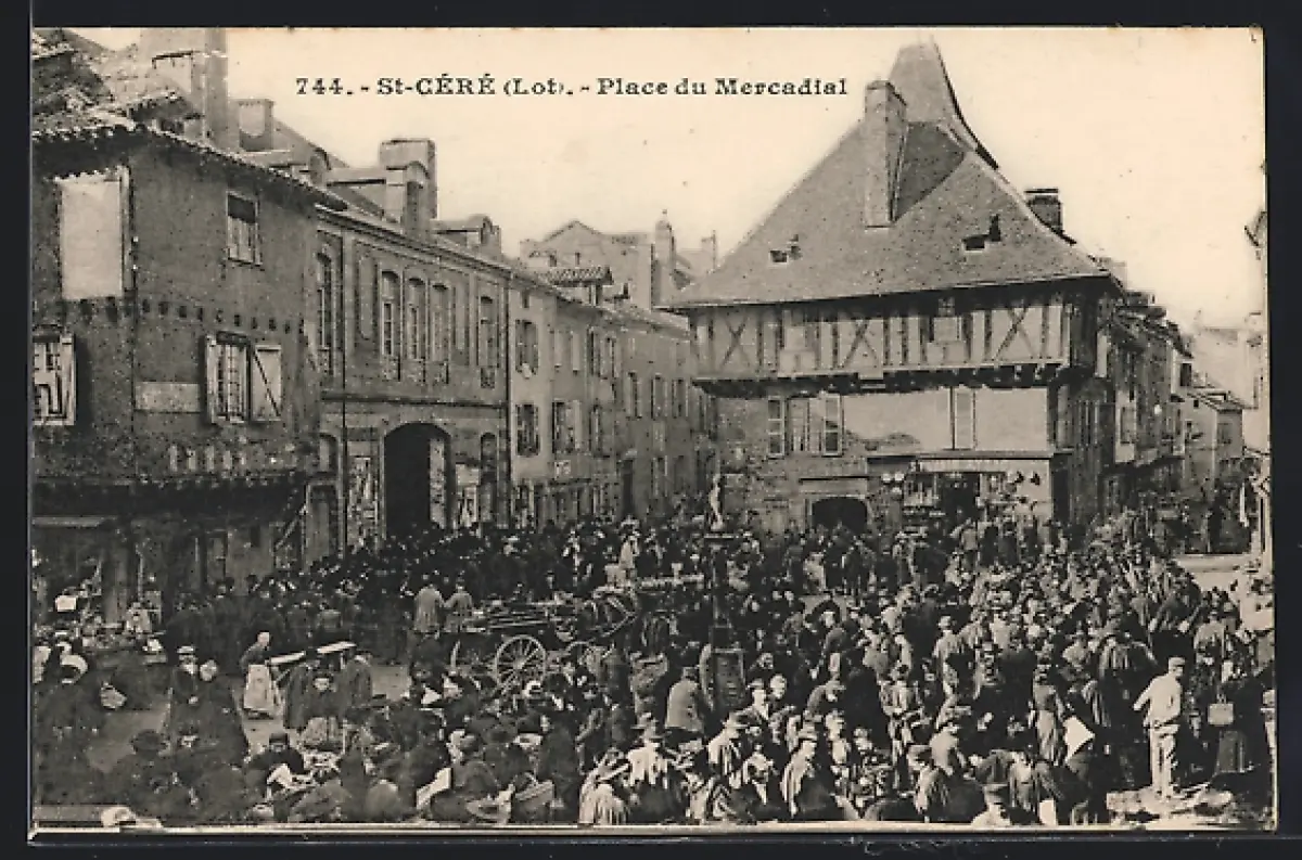 AK St-Céré /Lot, Place du Mercadial avec foule animée et bâtiments historiques