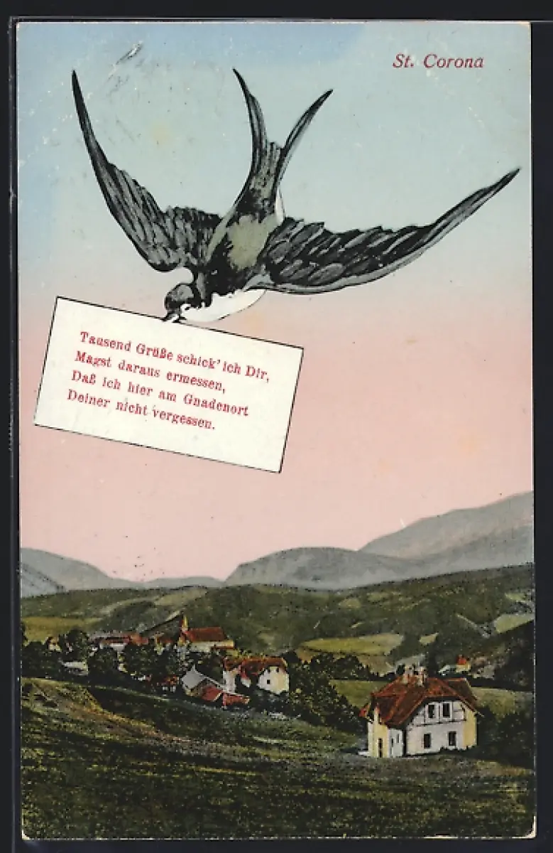 AK St. Corona, Ortspartie und Schwalbe mit Nachricht