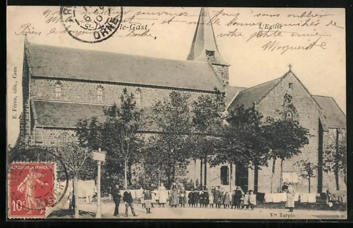AK St-Denis-le-Gast, Église et habitants rassemblés devant l`édifice