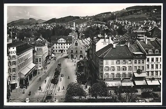 AK St. Gallen, Geschäftshäuser am Hechtplatz, Passanten und Strassenbahn