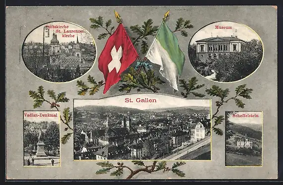 AK St. Gallen, Museum, Scheffelstein, Stiftskirche und Vadiandenkmal, Passepartout mit Fahne und Eichenzweig
