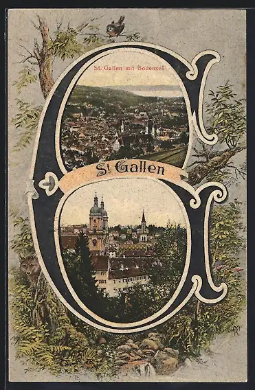 AK St. Gallen, Ortspartie, Totale des Ortes mit dem Bodensee, Buchstabe G