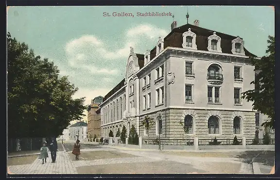 AK St. Gallen, Stadtbibliothek mit Strassenpartie