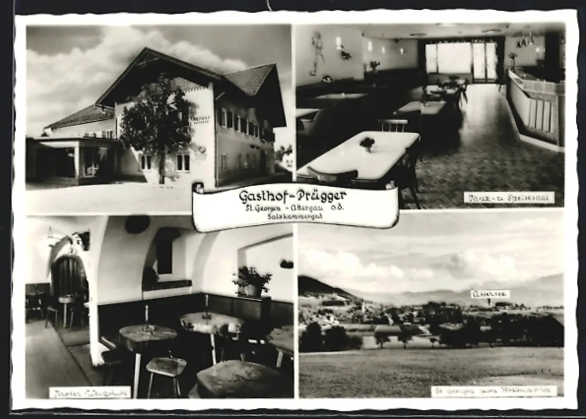 AK St. Georgen /O.Ö., Gasthof Prügger, Innenansicht, Ortsansicht und Gesamtansicht