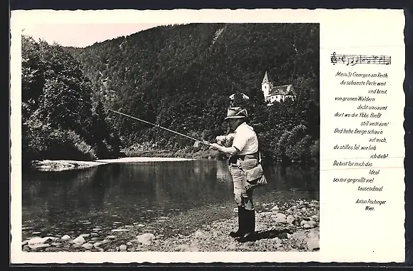 AK St. Georgen am Reith, Uferpartie mit Angler, Im Hintergrund Kirche