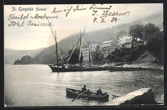AK St. Gingolph, Ortsansicht vom See aus mit Ruderern