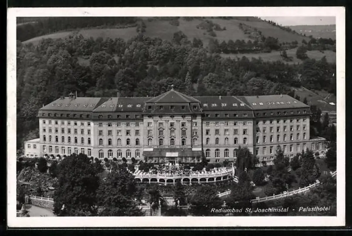 AK St. Joachimstal, Blick auf das Palasthotel aus der Vogelschau