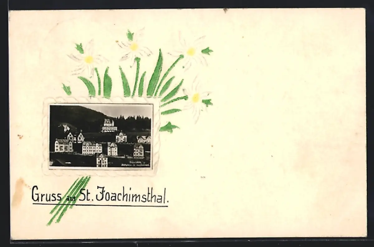AK St. Joachimsthal, Ortspartie aus der Vogelschau